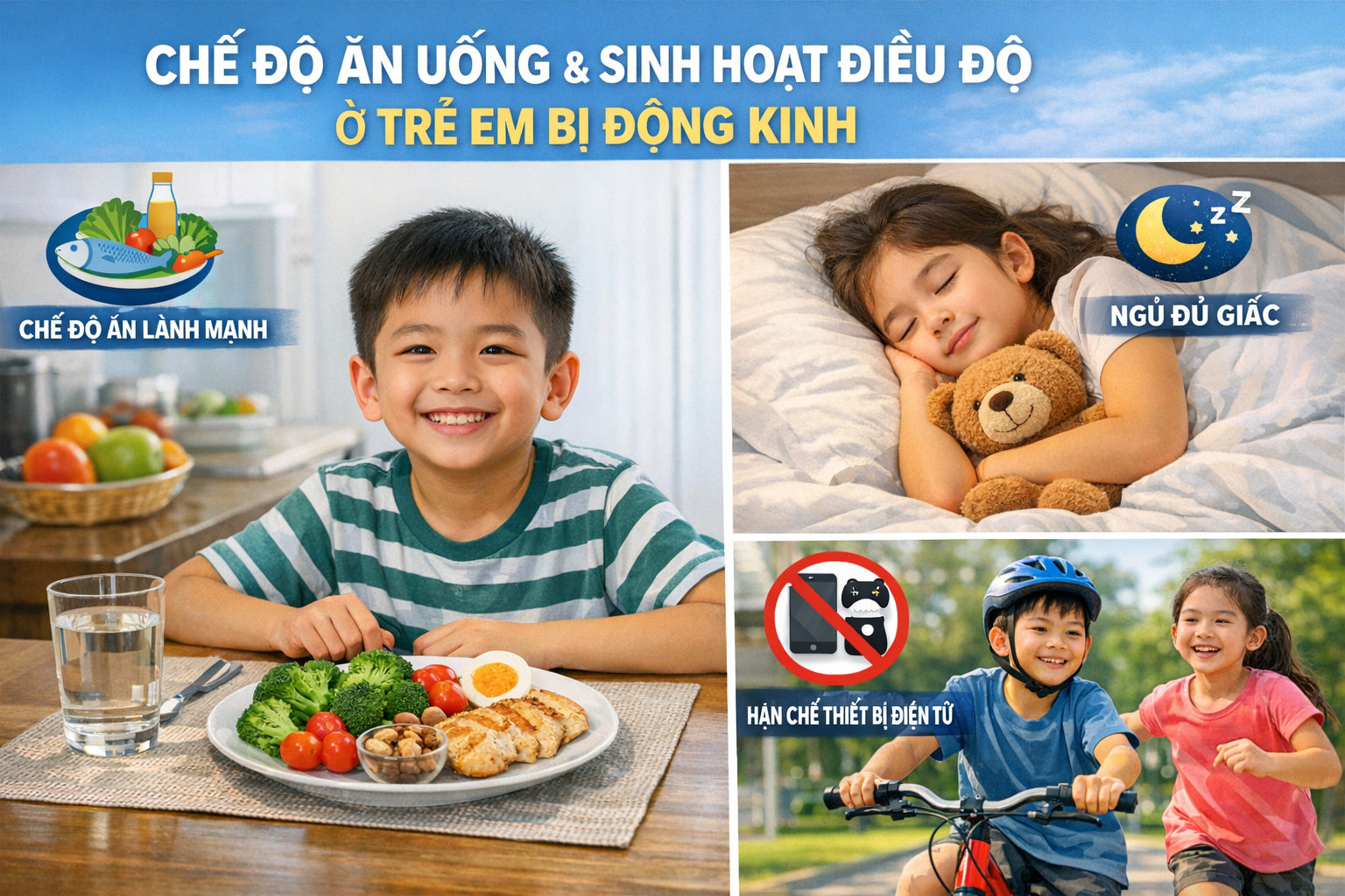 Chế độ ăn uống và sinh hoạt điều độ đóng vai trò vô cùng quan trọng trong việc hỗ trợ kiểm soát bệnh động kinh ở trẻ em. Bên cạnh việc tuân thủ phác đồ điều trị của bác sĩ, xây dựng lối sống khoa học giúp giảm tần suất lên cơn, nâng cao sức khỏe thể chất và tinh thần cho trẻ bị động kinh.