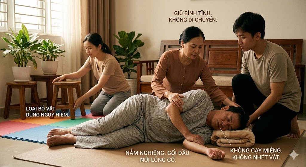 - Đảm bảo vị trí người đó ngã hoặc đi lại an toàn, loại bỏ các vật dụng xung quanh có thể gây thương tích.