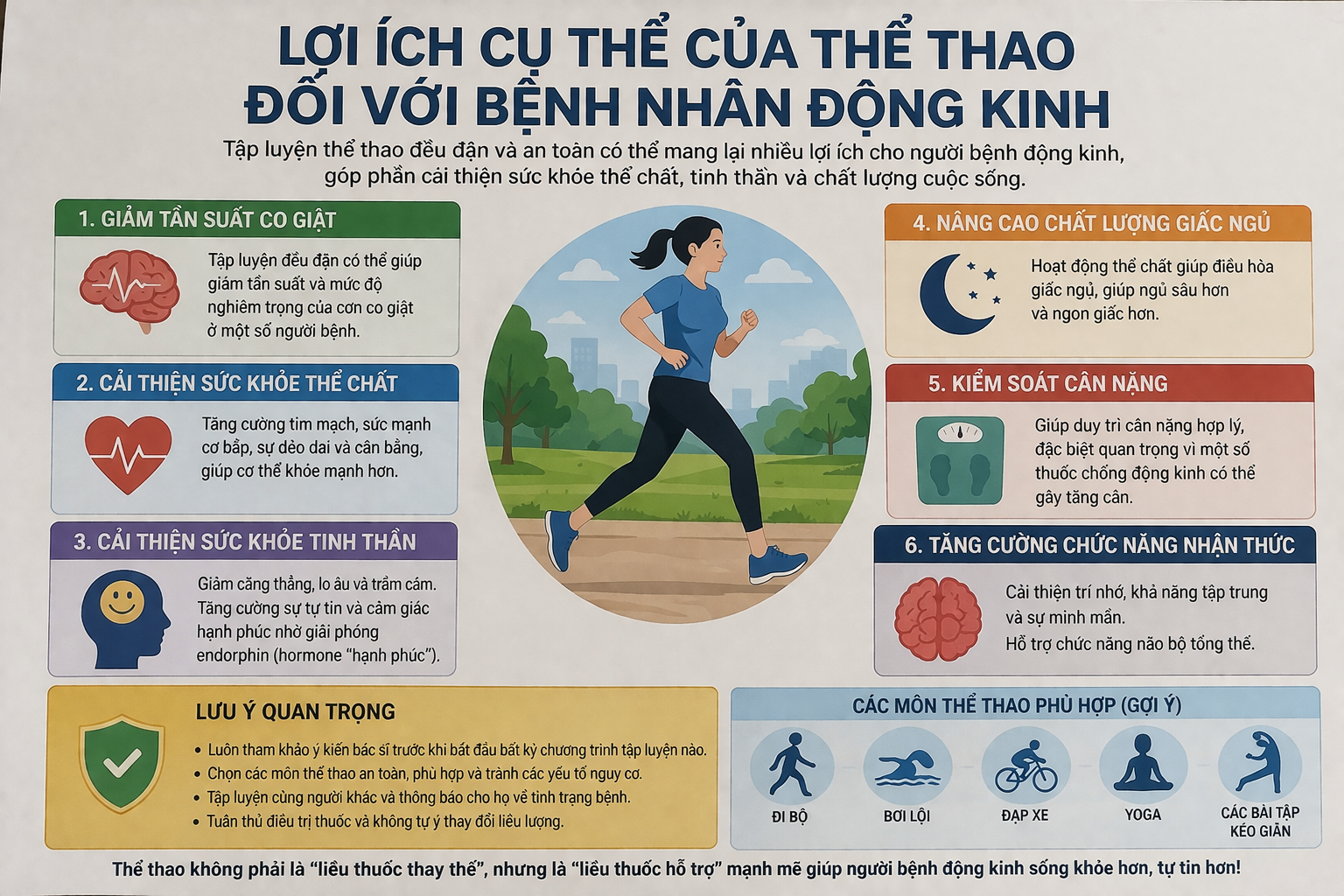 Luyện tập thể thao là một phương pháp đơn giản nhưng mang lại nhiều lợi ích to lớn cho bệnh nhân động kinh, đặc biệt trong việc cải thiện trí nhớ và chức năng nhận thức. Khi được thực hiện đúng cách, đều đặn và có sự hướng dẫn phù hợp, thể thao không chỉ giúp người bệnh khỏe mạnh hơn mà còn nâng cao chất lượng cuộc sống, giảm thiểu tác động tiêu cực của bệnh.