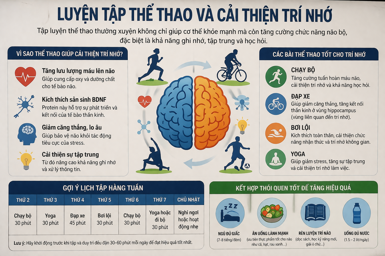 Hoạt động thể chất không chỉ tốt cho cơ thể mà còn mang lại lợi ích rõ rệt cho não bộ. Khi tập thể dục, cơ thể sẽ kích thích sản sinh các chất dẫn truyền thần kinh như dopamine, serotonin và endorphin – những chất có vai trò quan trọng trong việc điều chỉnh tâm trạng, tăng khả năng tập trung và cải thiện trí nhớ. Bên cạnh đó, tập luyện còn giúp: